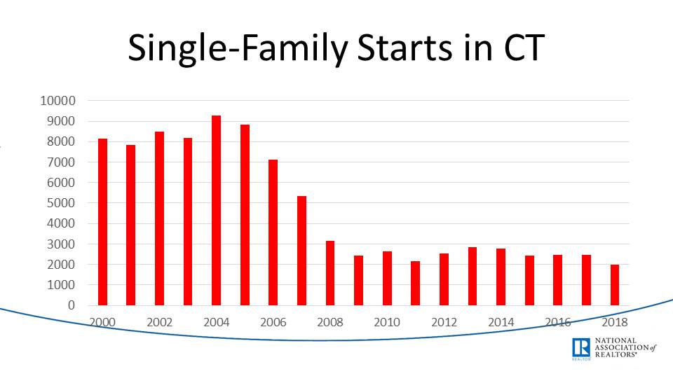 Single Family Starts in Connecticut are low. After the Recession, the amount of new construction in CT plummeted. This means builder sentiment had softened and stayed soft. This is expected during this type of crisis, but you would expect this number to rise ten years later. This might have to do with less expansion in CT because of the low demand for new housing. It could also be because of the saturation of buildable land. Either way, it’s not a great sign for CT.