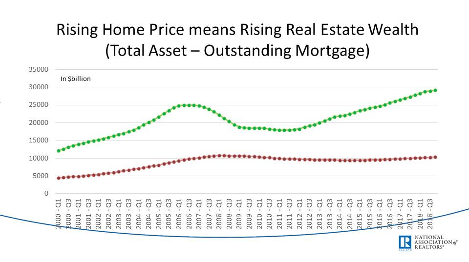 Total assets (green) versus outstanding mortgage amount (red). The area between these two lines is the wealth of America in real estate.