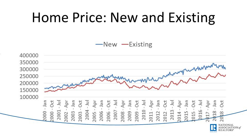 The gap between new versus existing home prices has grown after the recession, but both trend lines are on the rise. This implies that existing home prices took a bigger hit after the recession as compared to new home sales which persisted a bit better. This type of trend might look different on a local level.