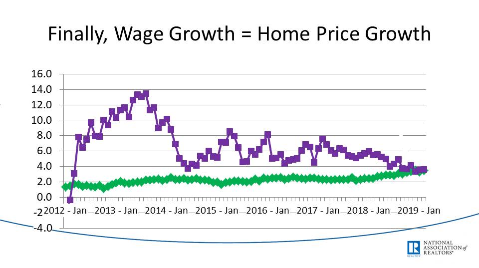 Wage growth is equal to home price growth, or rising at a similar rate. Good, buyers' purchasing power can keep up with the rising real estate prices.