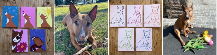 The heart of the organization is Phelps, an adopted bull terrier belonging to family friends Cindy and Eddie. Eddie was diagnosed with Parkinson’s disease more than a decade ago, and throughout his journey, Phelps was a constant source of comfort and joy. From a young age, Sasha drew fun birthday and holiday cards featuring Phelps in playful scenes (holding flowers, popping out of cakes, or decorating Christmas trees.) Those cards brought smiles to Eddie during even the hardest days. What began as a personal gesture of love became something bigger when Sasha decided to digitize her designs and share them with a wider audience.